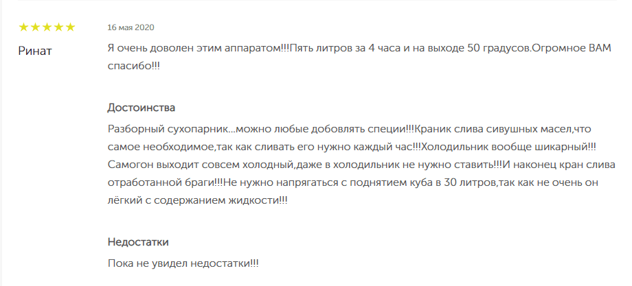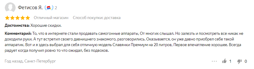 Говорят, гнать на продажу нельзя. А я вот делаю отменный самогон. На это у меня, конечно, совсем другое оборудование. А Славяночку купил как самый недорогой вариант, например, пробовать новые рецепты. Она нынче улучшенная – считаю ее выгодным вложением в бизнес. На прежней холодильник был похуже, а теперь появилась доработанная версия. Старой моделью в целом тоже был доволен, но уже не пользуюсь. Мы с женой реализуем торговую деятельность с лицензией, напитки делаем разные. Покупаем второй раз! У компании этой брали еще и пивоварню, производитель проверенный. Настоящим ценителям качества советую.
